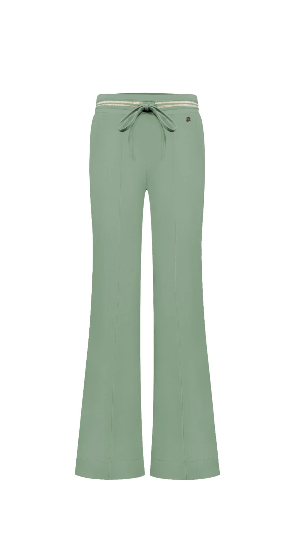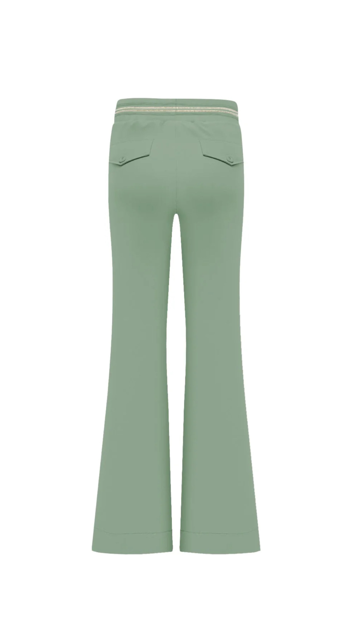 De elastische tailleband met luxe gouden bies en trekkoord zorgt voor extra comfort én een verfijnde uitstraling. Praktische steekzakken aan de voorzijde en stijlvolle faux paspelzakken aan de achterzijde maken deze dames flared broek compleet. Perfect voor zowel een zakelijke outfit als een comfortabele, modieuze look voor elke dag.